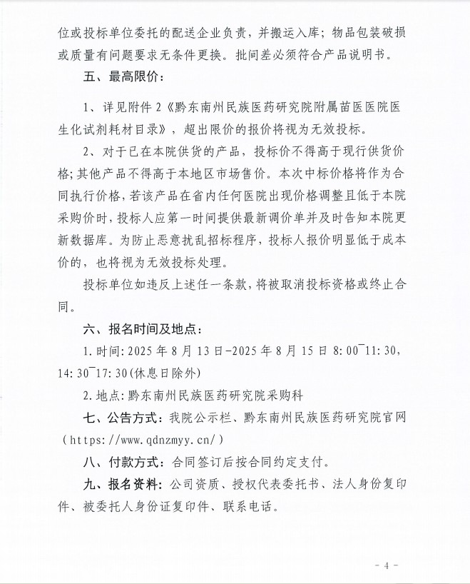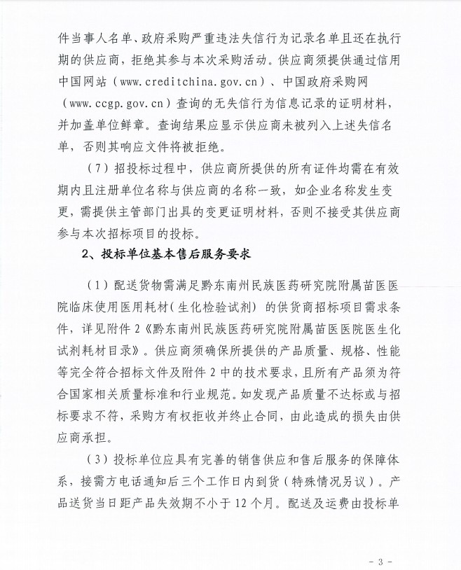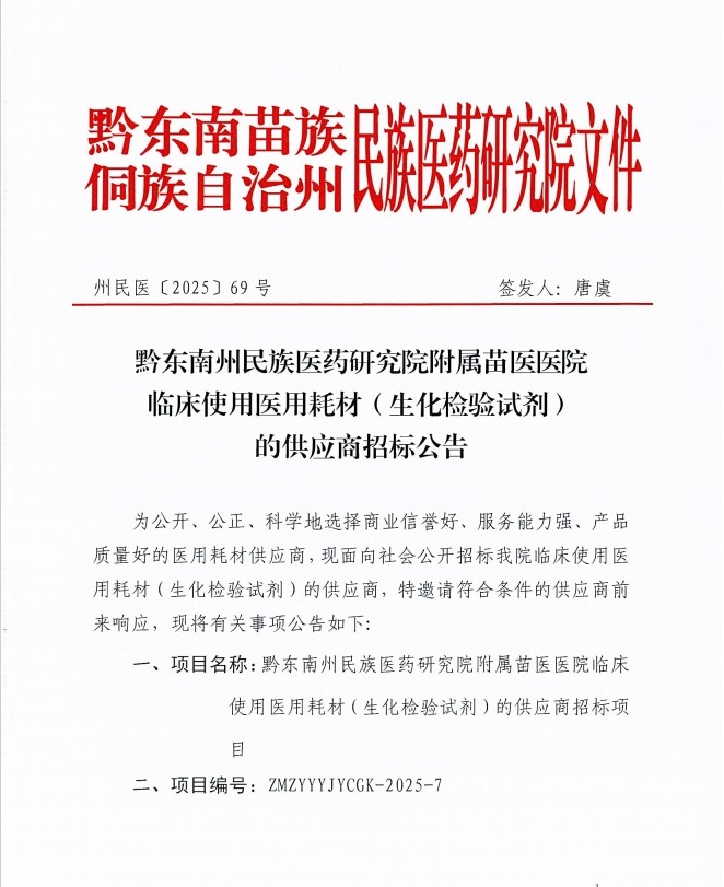 黔东南州民族医药研究院附属苗医医院临床使用医用耗材(生化试剂耗材)的供应商招标项目公告