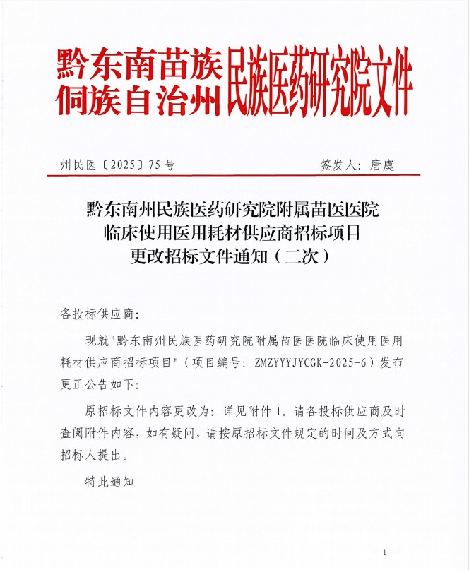 黔东南州民族医药研究院附属苗医医院临床使用医用耗材供应商招标项目更改招标文件通知(二次)