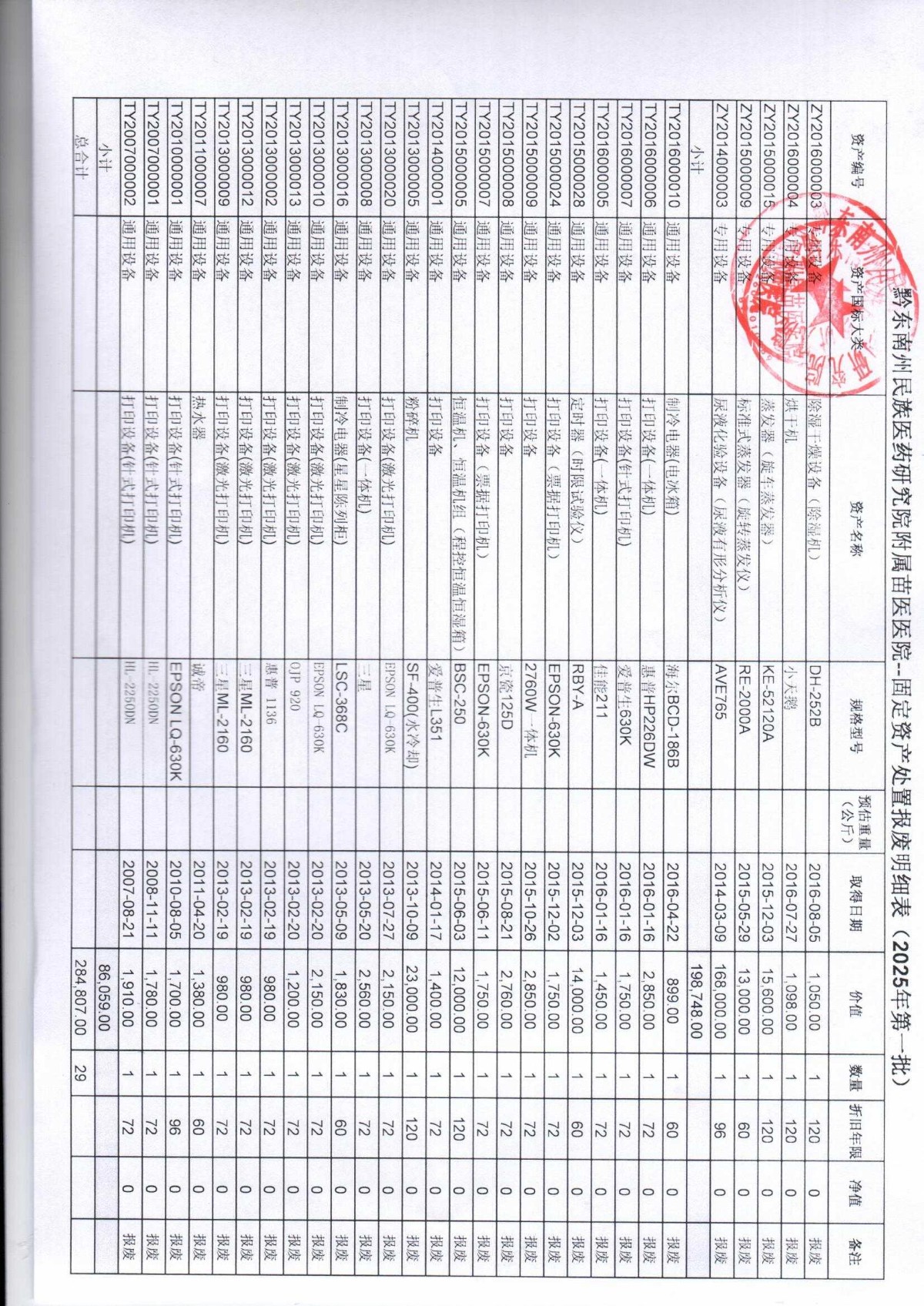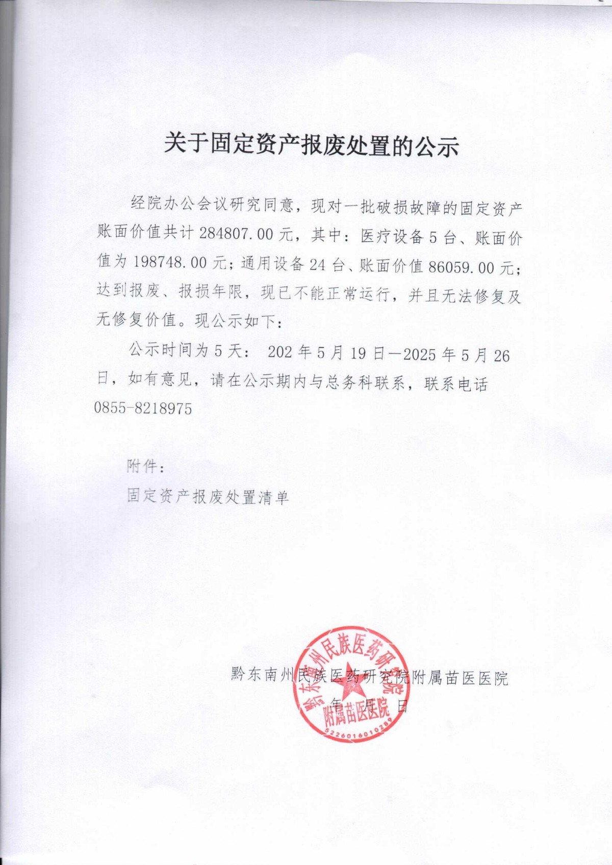 关于固定资产报废处置的公示(苗医院)