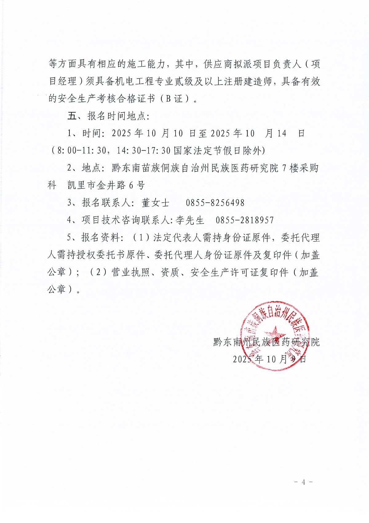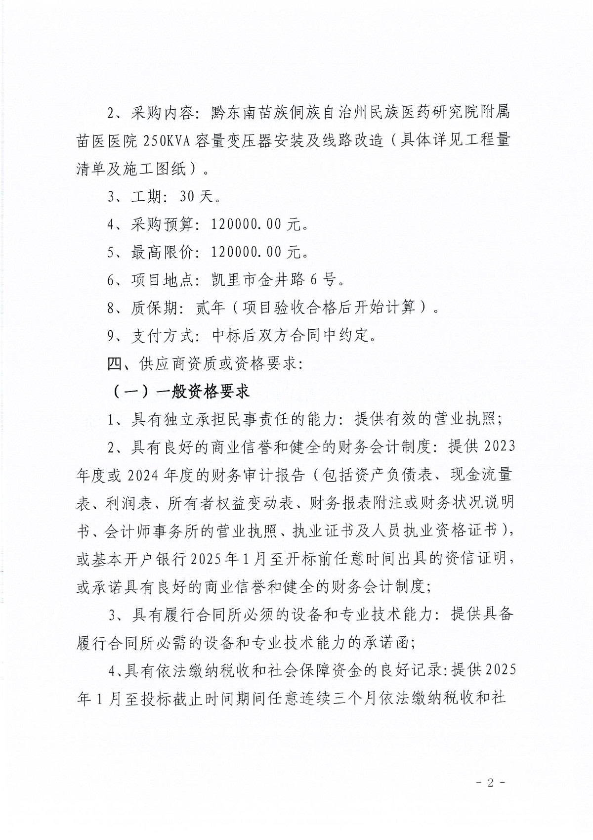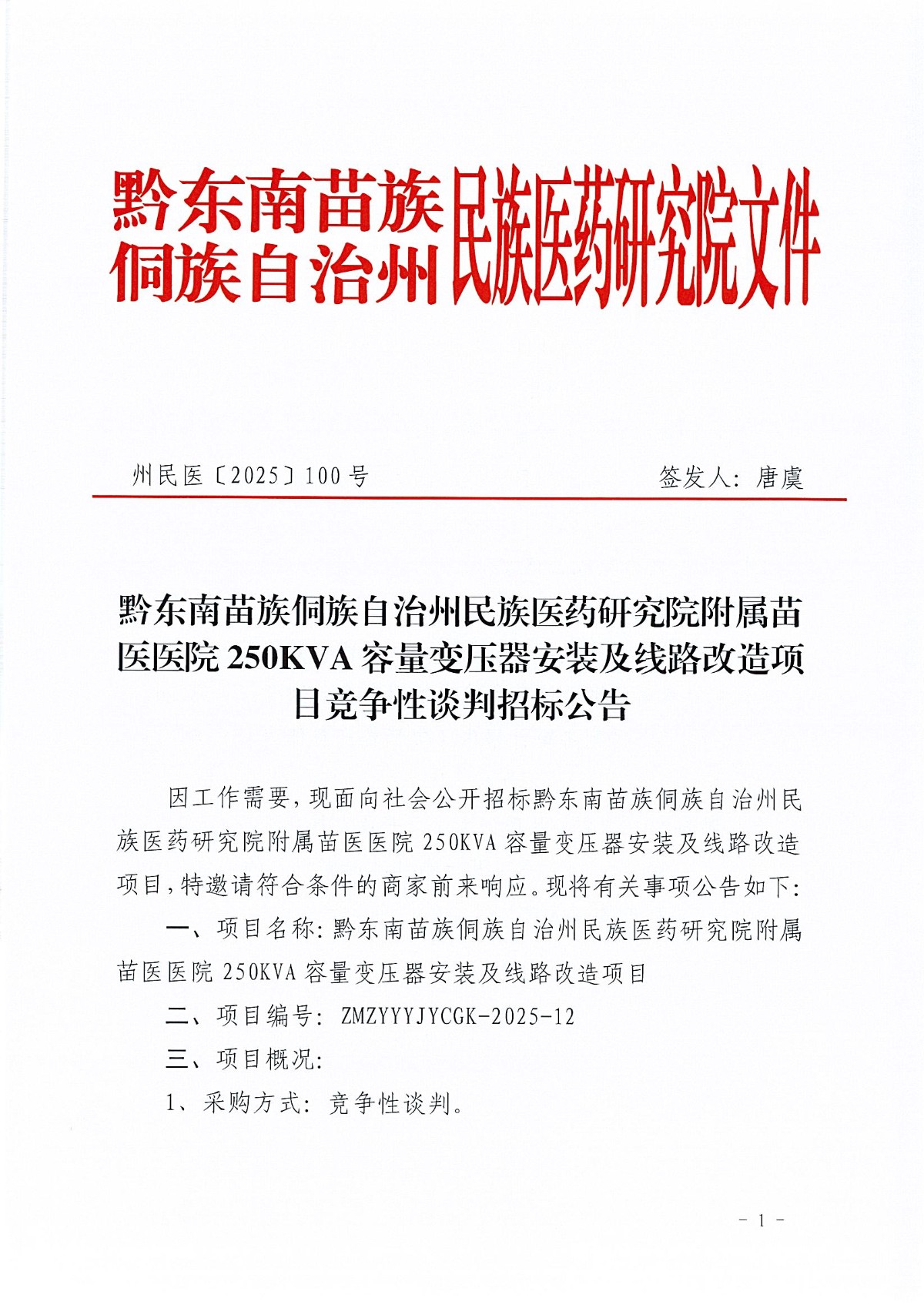 黔东南州民族医药研究院附属苗医医院250KVA容量变压器安装及线路改造项目竞争性谈判招标公告