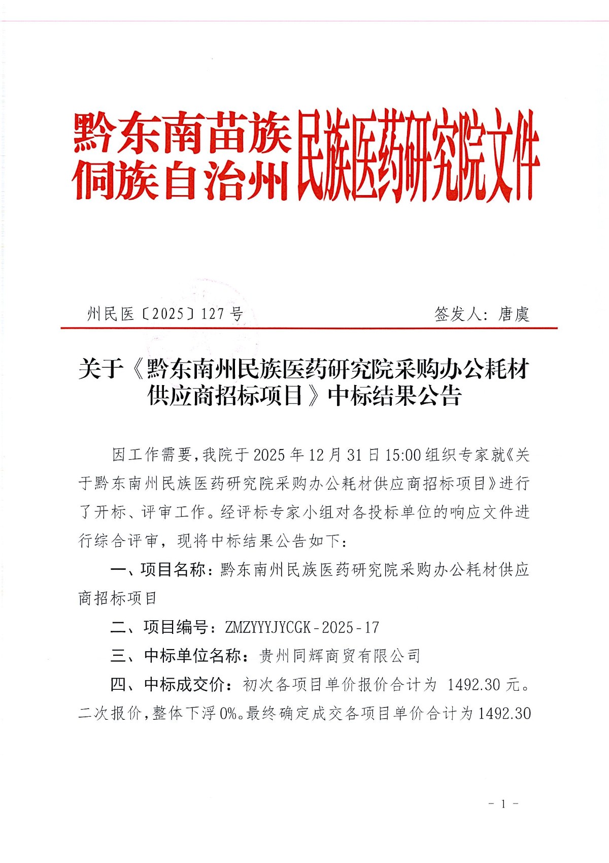 关于《黔东南州民族医药研究院采购办公耗材供应商招标项目》中标结果公告