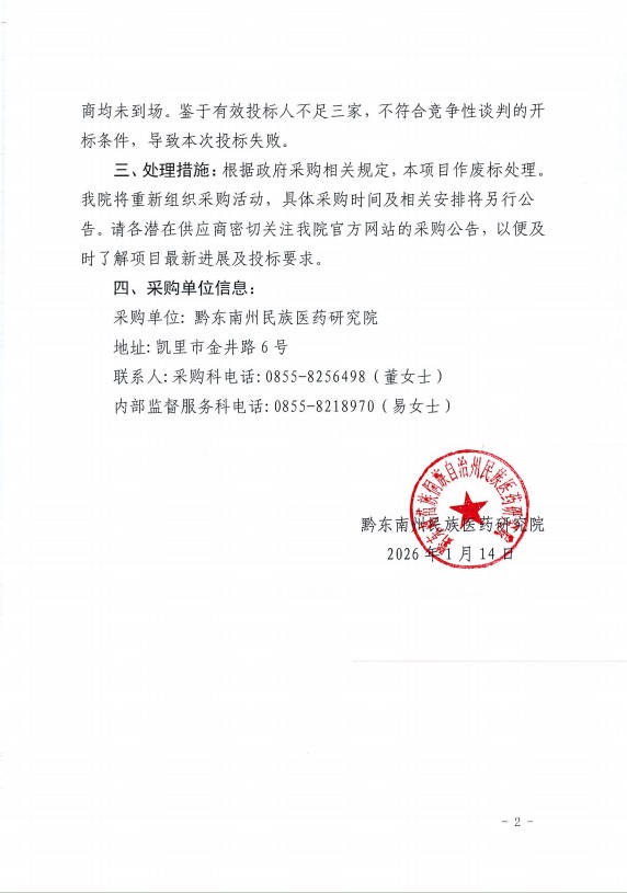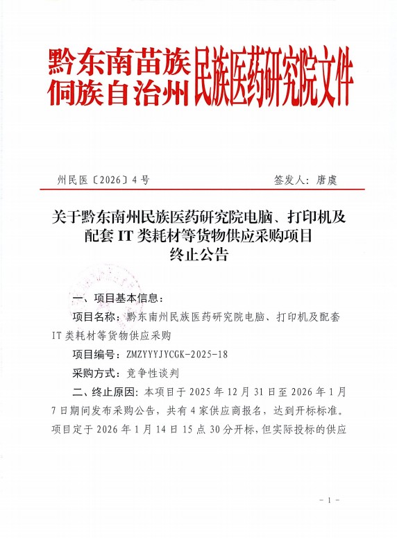 关于黔东南州民族医药研究院电脑、打印机及配套IT类耗材等货物供应采购项目终止公告