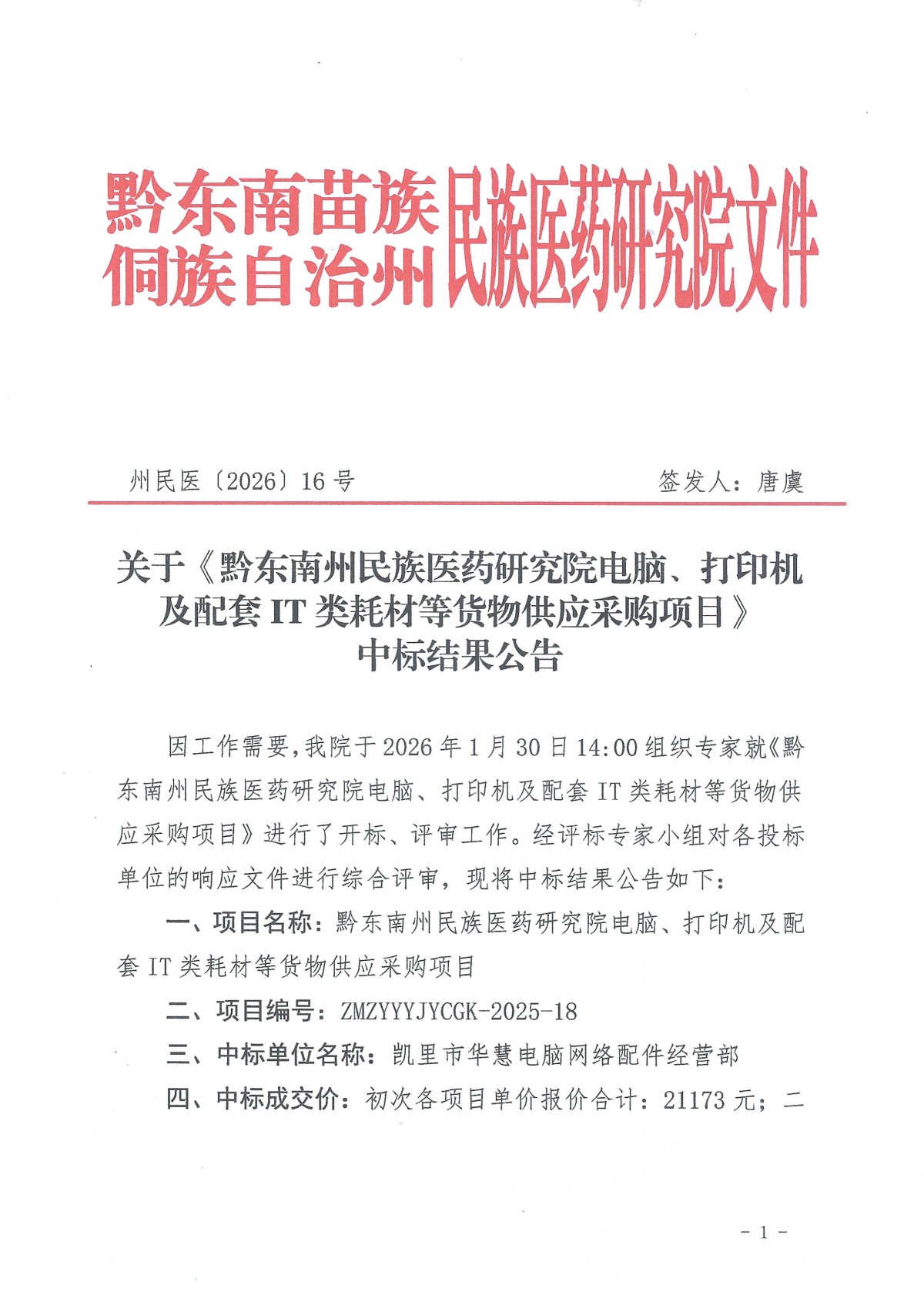 关于《黔东南州民族医药研究院电脑、打印机及配套IT类耗材等货物供应采购项目》中标结果公告