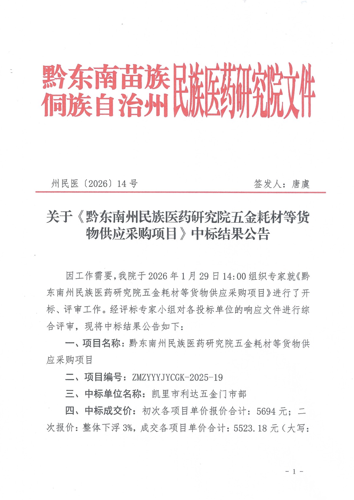 关于《黔东南州民族医药研究院五金耗材等货物供应采购项目》中标公告