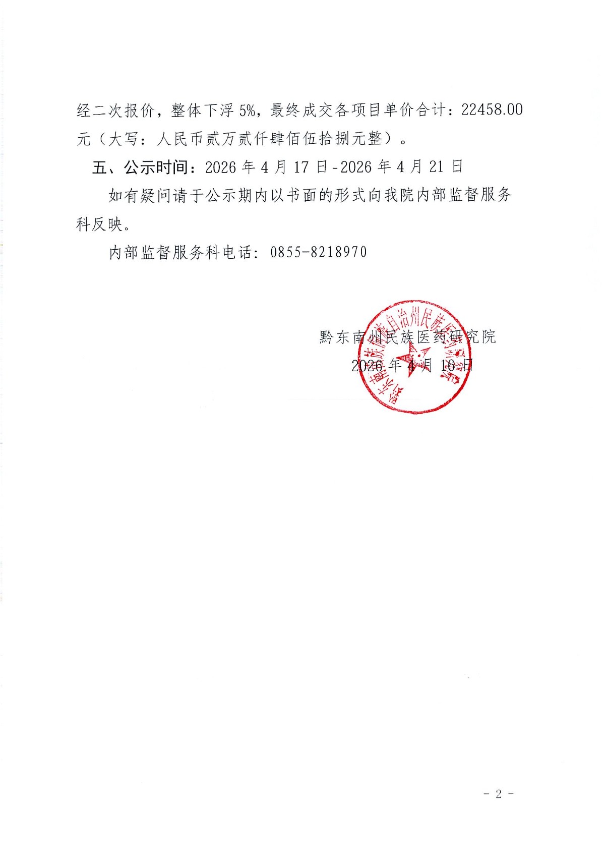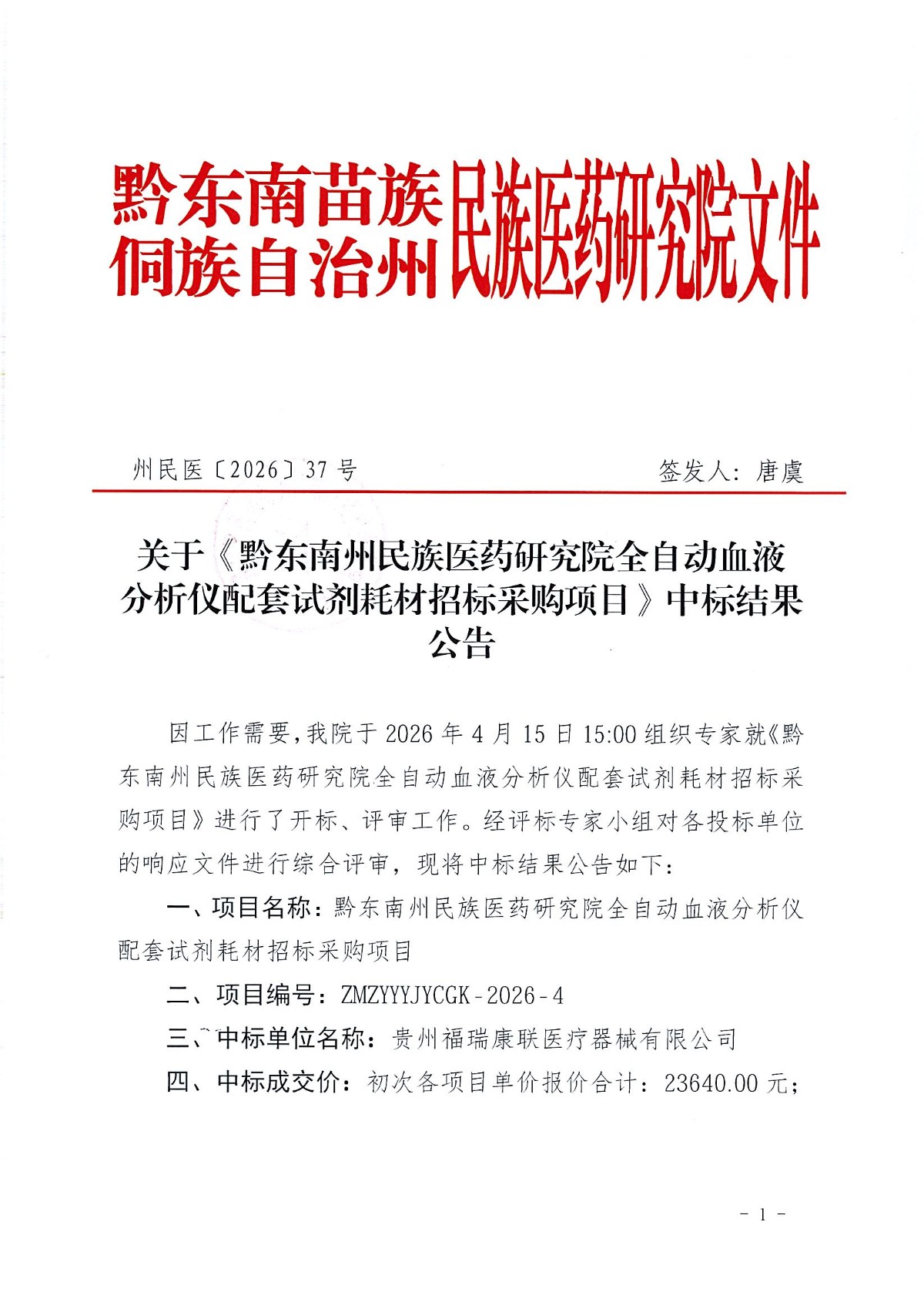 关于《黔东南州民族医药研究院全自动血液分析仪配套试剂耗材招标采购项目》中标结果公告